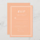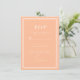 Simples e elegante, esta placa de gabinete RSVP de casamento moderna apresenta um design minimalista com uma borda dupla de quadros em branco nítido em um fundo de pêssego contemporâneo. Personalize com a data do seu casamento e os itens de menu selecionados. Espaços fornecidos para seu convidado adicionar seus nomes e respostas para uma resposta de retorno. As letras e os scripts estão em branco nítido. A parte traseira da placa corresponde a pêssego sólido.
