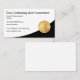 Coletor de moedas e modelo de cartão de negócios de temas numismáticos desenhado com uma moeda de ouro no fundo e design moderno elegante com um esquema clássico que você pode personalizar online. Criado para um distribuidor, distribuidor, cobrador ou serviços de investimento de moeda.