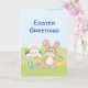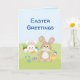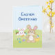 Páscoa Greeting apresenta um coelho marrom giro carregando sua cesta com ovos coloridos de Páscoa. Na parte de trás do coelho marrom está um coelho branco a espreitar de um buraco de coelho, a observar. Há uma caixa de texto na dentro para você adicionar sua própria mensagem.