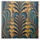 Um painel do estilo vintage, ornamentado simétrico e estilizado, com design floral. A paleta de cores é renderizada em vários tons de azul, criando profundidade e dimensão. O fundo é um amarelo acinzentado, fornecendo um contraste quente com os azuis legal. A design é esboçada com um cobre metálico que adiciona definição e senso de idade à peça. O estilo global evoca uma sensação de artesanato Art Deco.