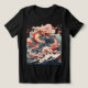 Cherry blossom petals scatter across the water and sky, adding a poetic contrast to the turbulent scene. The color palette—featuring warm golds, fiery reds, ocean blues, and soft pinks—evokes a feeling of elemental balance: destruction and renewal, storm and serenity.