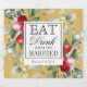 Um design elegante e festivo feriado temido com frutas vermelhas e verde sobre um fundo de ouro rústico desenhado para casamentos, chás, festas de aniversário ou outros eventos celebrando o amor durante o Natal ou o inverno. O texto branco e antigo convida o casal a "EAT, Drink, and be CASADO". Um modelo de texto é incluído para personalizar com os nomes da noiva e do noivo ou do casal.