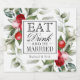 Um design elegante e festivo feriado temido com bagas vermelhas e verde em fundo branco desenhado para casamentos, chás, festas de aniversário ou outros eventos celebrando o amor durante o Natal ou o inverno. O texto branco e antigo convida o casal a "EAT, Drink, and be CASADO". Um modelo de texto é incluído para personalizar com os nomes da noiva e do noivo ou do casal.