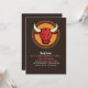 Um convite excelente do tema ocidental para um rodeio ou uma celebração em uma churrascaria. O fundo escuro de chocolate-marrom apresenta a cabeça de um touro vermelho com fundo circular de ouro.