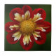 Azulejo cerâmico que apresenta a foto de uma flor colorida, vermelha Collarette Dahlia, com pétalas brancas e interiores e centro grande, amarelo sobre fundo verde-escuro. Um design floral adorável! Selecione o tamanho do seu azulejo. Faz uma trivet de cozinha excelente!