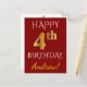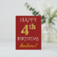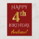 Este simples e personalizado design de cartão de aniversário apresenta a mensagem "FELIZ 4º ANIVERSÁRIO", com o "4º" a ter uma aparência falsa de ouro. A frente também apresenta um nome personalizado e um fundo vermelho. A parte de trás apresenta uma mensagem de saudação de aniversário personalizada, juntamente com o endereço personalizável do destinatário do cartão postal de aniversário. Pode ser enviado a alguém que comemora seu quarto aniversário. [~Z0000071]