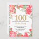 Red Floral 100º Convite de Aniversário para Mulheres. Flor Botânica De Aquarela. Dourada Glitter. Flores Florais De Peões Rosa. Aniversário Adulto.