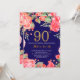 Convite de Aniversário para 90 Vermelho para Mulheres. Flor Botânica De Aquarela Dourada Glitter. Fundo Azul marinho. Flores Florais De Pêonias Rosa. Aniversário Adulto. Para mais personalização, clique no botão "Personalizar" e use nossa ferramenta de design para modificar este modelo.
