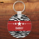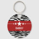 Tendy e moderno Chaveiro da Estrela Sassy Zebra apresentando um fundo de impressão em branco e preto chico e uma borda vermelha ousada adornada com um divertido motivo de estrela. Este design feminino pode ser personalizado com o texto personalizado de sua escolha. Clique em "Personalizar" para encontrar mais opções de personalização.