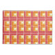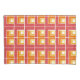 Essa fronha tem um design geométrico de L's em vermelho, laranja e amarelo, colocado em diferentes direções num campo de branco.