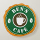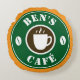Almofada de decoração personalizada para café. Desenho redondo de grão de café e xícara. Personalize com nome da empresa, funcionário, barista ou nome da empresa de café / bar. Cores verde e marrom. Decoração de casa trendy para lounge de café. Cor de fundo laranja ou personalizada.