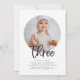 Um terceiro convite de aniversário moderno com uma fotografia redonda e a palavra 'três' em uma letra de estilo caligráfico, perfeito para o seu aniversário de 3 anos!