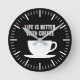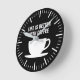 A vida é melhor com o relógio da cozinha do café com grandes índices de discagem modernos. Trendy decor para café, cafeteria, restaurante, empresa, escritório, bar ou compro. Cores pretas e brancas ou personalizadas. Personalize com sua própria citação engraçada, dizendo ou mandando mensagem. Condecorações de moda para amante de café, barista, viciado em cafeína, amigos, família etc. Copo de café e logo de disco.