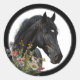 Adesivos de cavalo preto. Flores silvestres crescem perto da cabeça de um belo cavalo preto. Ele tem um pequeno pedaço de branco no rosto, mas tudo o mais é preto. O adesivo é branco com uma borda preta e cinza. Adesivos redondos vêm em dois tamanhos.