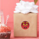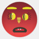 Um adesivo de rosto triste de olhos amarelos. O rosto é vermelho, os olhos são amarelos, ela tem dois dentes dianteiros, um nariz cardíaco, e sobrancelhas amarelas.