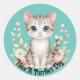 Imagem adorável de um gatinho fofo com flores, é apresentada neste adesivo redondo. Com a mensagem, "Tenha Um Dia Perfeito", isso torna um ótimo adesivo para usar em envios especiais, scrapbooking e muito mais!