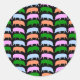 Este adesivo redondo apresenta uma série de diferentes porcos coloridos do estilo cartoon. Os porcos estão em linhas alternadas de rosa e azul e verde e laranja. O fundo é preto.