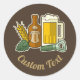 Ilustração de cerveja. Frasco, vidro, abridor, saltos e cevada. Cor de fundo personalizada. Custom Text.