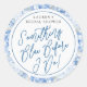Adicione um toque charmoso aos brindes do seu chá de noiva com este adesivo “Something Blue Before I Do”. Rodeado por hortênsias em aquarela e flores brancas suaves, este design redondo é perfeito para selar envelopes, enfeitar sacolas de brindes ou adicionar à decoração da festa. Personalize com o nome da noiva e os detalhes do chá.