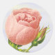 Uma bela rosa repolho rosa com um botão de rosa menor começando a abrir em um fundo azul e creme nublado. Um close-up elegante de uma pintura botânica vintage.