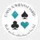 O brilho azul falso e os naipes de cartas pretos são circulados por texto personalizável, tornando esses adesivos redondos perfeitos para todos os tipos de projetos e ocasiões. Use-os para rotular lembranças para convidados de casamento, para fechar envelopes e muito mais.