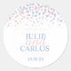 A queda gráfica moderna faz com que o adesivo do casamento se torne em tons azuis, cor-de-rosa e brancos. Parte do moderno jogo de papelaria de confetti. Desenhada por Sarah Trett.