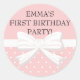 Redondo Bolinhas rosa e branca com adesivo de aniversário