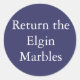 Um adesivo azul "Return the Elgin Marbles". Os Mármores de Elgin, também conhecidos como mármores do Partenon, foram doados ao Museu Britânico pelo Conde de Elgin, que os removeu da acropolis ateniense. Algumas pessoas dizem que devem ser devolvidas aos gregos, outras dizem que devem ficar na Grã-Bretanha. Agora você pode mostrar sua lealdade! Também temos os adesivos "Keep the Elgin Marbles" :