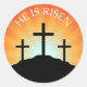 Etiquetas de Páscoa decorativas ou selos de invólucro com três cruzes como silhuetas contra fundo solar. Texto "Ele está levantado".