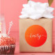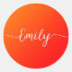 Fundo de gradiente laranja vibrante para autocolantes redondos. Experimente a elegância de nossas fontes com belos balanços. Design de arte linda de Alma Wad. Personalize-o sem esforço com seu próprio texto ou nome. Melhore o seu nome com baloiços de na moda. Basta colocá-lo entre os símbolos fornecidos na seção de personalização.