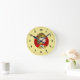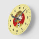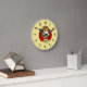 Relógios com ilustração da cabeça de um vestido de leão sorridente em vestido desportivo vermelho que segurava uma bola de futebol, em círculo vermelho, ilustrado por Radka Kavalcova