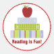 Um adesivo redondo colorido para promover a leitura, com gráficos de uma pilha colorida de livros, com uma maçã vermelha no topo. Uma borda pontilhada de polca vermelha, ao redor da borda do adesivo, e texto personalizado vermelho que lê: Ler é Executar! Personalizar para alterar o texto.