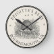 Promova seu negócio de apicultura com este relógio de parede de nome apiário personalizado. Adicione o nome e o local da sua empresa ou adicione o nome do proprietário ou o ano estabelecido. ideia de Excelente para celebrar uma abertura de negócios ou um marco. Vintage pula design com abelhas no centro. Fronteira negra espessa.