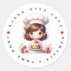 Moderno cozido com adesivo personalizado de padaria amorosa. Um chef de padaria bonito segurando um delicioso bolo de fosco de morango.