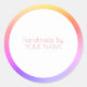 Um adesivo redondo alegre com uma borda suave em gradiente de arco-íris e texto personalizável "feito à mão por" adiciona um acabamento brilhante e amigável a pacotes, envelopes e embalagens para pequenas lojas e pedidos da Etsy. O centro branco limpo mantém os nomes das marcas legíveis enquanto a borda colorida chama a atenção e cria um momento feliz de desempacotamento para a apreciação do cliente. O texto pode ser totalmente personalizado para incluir o nome da loja ou linha de contato.