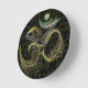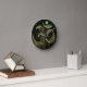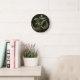 Redondo pavão preso a preto no relógio da parede preta