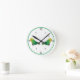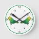 Dois pássaros sentados nos números 8 e 4, com seus bicos apontando 9 e 3. Os pássaros têm corpos amarelos com anel verde ao redor do pescoço. Asas verdes claras e escuras e cauda. O círculo verde marca a borda externa da face do relógio.