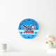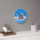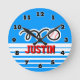 Relógio de baseball com nome para meninos esportivos. Design para pequenos jogadores de bola ou quarto de berçário. Personalize com o nome da criança. Cor de fundo personalizada é azul ou rosa para a menina. A decoração do quarto das crianças.