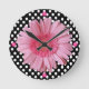 Bonito relógio decorativo de parede feito em um padrão de bolinhas preto e branco. Um florescimento de margarida alemã, cor-de-rosa, melhorado graficamente, decora o meio, e quatro botões cor-de-rosa denota um quarto de horas. Personalize para adicionar qualquer texto que você queira. Na moda que faz uma ideia de presente de excelente.