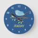 Relógio de Nursey com pássaro bonitinho em uma ilustração de galho. Nome pessoal das crianças. Boa ideia para o quarto de bebê do menino. Design animal.