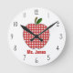 Um relógio para os professores com ilustração de uma maçã de gingham vermelha. Personalize com o nome do seu professor em vermelho.