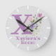 Relógio De Quarto De Crianças. Design apresenta Monograma & Nome com Flores em ambos os lados no estilo pastel de cor de água. O nome de exemplo é Xavie. Altere o nome conforme desejado para qualquer pessoa com um nome que comece com X.