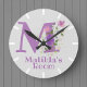 Relógio de quarto de criança. Design apresenta Monograma & Nome com Flores em ambos os lados no estilo pastel de cor de água. O nome do exemplo é Matilda. Mude o nome como desejado para qualquer pessoa com um nome começando com M. Uma hora brilhante e divertida para qualquer quarto infantil. Seu filho vai gostar de ter seu nome impresso corajosamente no rosto do relógio.
