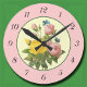 Um relógio de parede com uma reprodução antiga de rosas cor-de-rosa e amarelas do trabalho de arte botânico vintage pelo famoso artista Pierre Redoute com borboletas azuis sobre um fundo falso de pergaminho e números antigos em preto sobre fundo rosa.