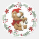 Este adorável Adesivo Redondo apresenta uma coroa de Natal e um ursinho fofo vestindo um chapéu de Papai Noel e segurando um sino.