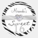 Borda de zebra branca e preta decorada com imagens impressas de fita branca prateada e joia em forma de Festa de aniversário doce 16. Os itens correspondentes são mostrados abaixo: