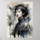 A young woman with elegant attire and a decorative headpiece is depicted against a watercolor background.