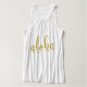 O topo do tanque de Verão apresenta uma magenta rosa-rosa-quente azul-escura e um abacaxi branco amarelo-esbranquiçado pastel com um guião aloha-reluz falsa na frente e um grande guião de pincel aloha-ouro falso no verso.