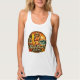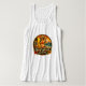 Turn heads with this fun and flirty Island style graphic print scoop neck tank top. The retro inspired design captures vintage California surf shack energy with a blonde pin-up surfer clutching her surfboard, waves crashing onto the beach, with an antique van in the background. The ride the wave motto, paired with tropical hibiscus flowers complete the salty coastal sunset scene.