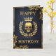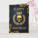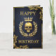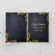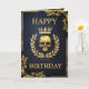 Um cartão de aniversário de couro azul escuro e luxuoso adornada com alivio de ouro gótico real apresentando um crânio ouro ameaçador flanqueado por uma coroa de louros de folhas de ouro e, finalmente, uma coroa de ouro gloriosa brilhando com luz deslumbrante simbolizando uma antiga linhagem real. Perfeito para um aniversário real e real temático com um toque gótico perfeito para amantes da bruxaria escura e gótica, arcana e horror macabro.
